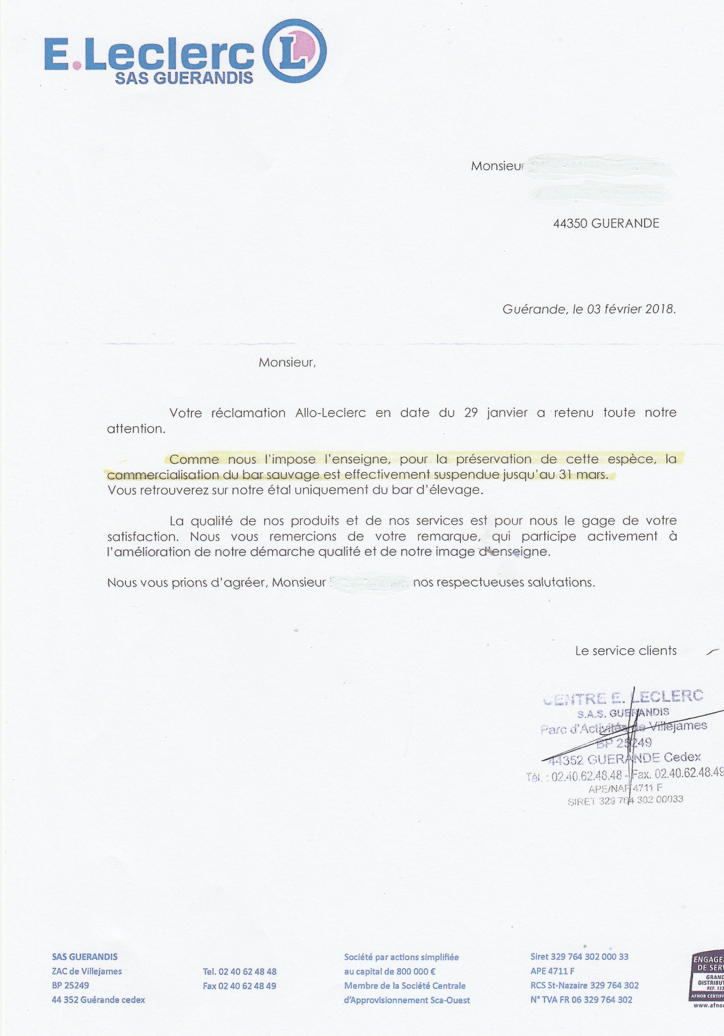 Réponse positive du Leclerc de Guérande (pièce jointe ) auquel j'avais adressé un courrier par mail . Pas de bars sur l'étal avant le mois d'avril . Un premier pas est fait, la grande distribution bouge quand même ,en tout cas pour certaines enseignes. Reste les autres , par exemple, les poissonniers du marché de La Turballe qui samedi vendaient du bar de chalut . Encore du boulot pour convaincre ....