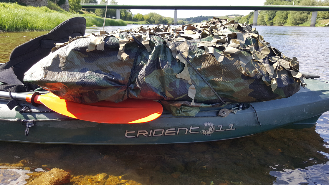 Kayak chargé en soute, avec un sac étanche de 80 l presque plein dans le bac arrière et le Bed Chair au dessus dans la bâche, sous le filet.