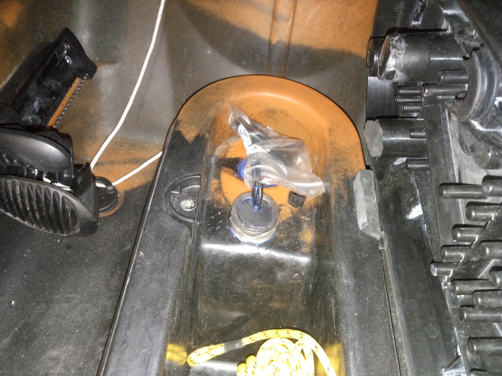 Commentaire: Fixation arrière avec une corde tendue et un morceau de sangle ajouté avec des inserts etanches