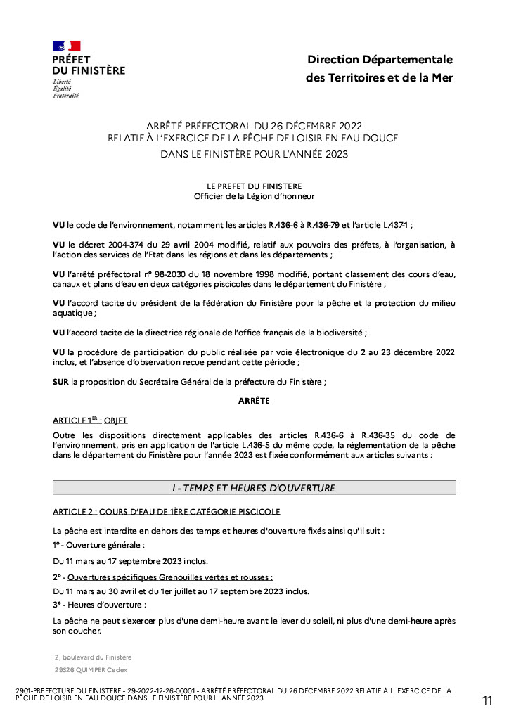 Pour les amateurs de pêche en eau douce du Finistère, l'arrêté 2023 est sorti vous le trouverez ci dessous, l'arêté migrateur sortira plus tard, je vous le transmettrai dès que je l'aurai, bonne lecture :wink: