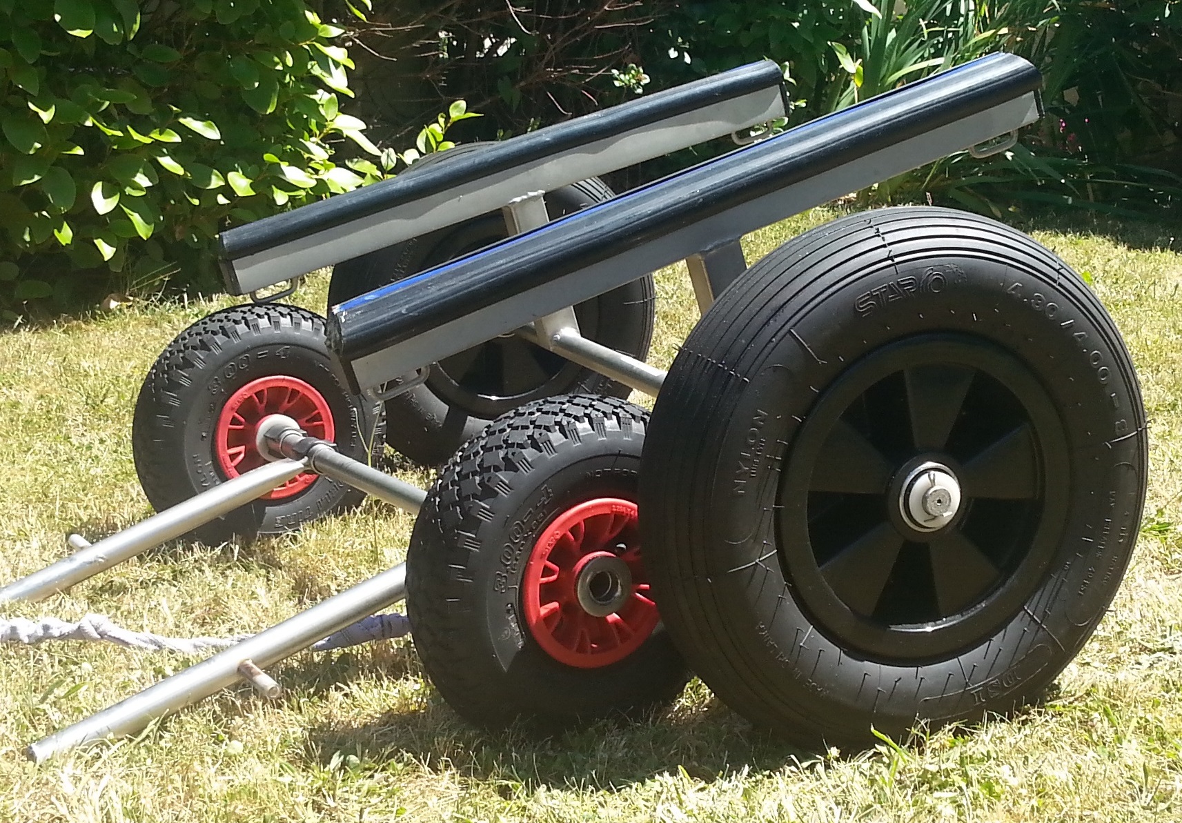 Ce chariot s'insère dans les nervures de mon ABACO au milieu du bateau, le poids est idéalement réparti. Cela roule sans effort sur route, chemin et même dans le sable d'autant qu'il s'agit de roue de char à voile munie de roulements.